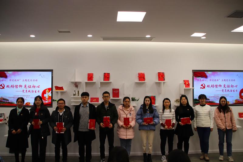 主题党日活动过程中,魏群、吴江洁两位老师为过政治生日党员代表赠送了“政治生日贺卡”和“生日礼物”,并对活动做了点评。吴江洁分享了自己去延安学习的经历,鼓励全体党员坚守初心,做到四个正确认识:正确认识世界和中国发展大势,正确认识中国特色和国际比较,正确认识时代责任和历史使命,正确认识远大抱负和脚踏实地;魏群将这次活动概括总结为为“四个一”,即重温了一次入党誓词,开展了一次对《中国共产党章程》的集中学习,分享了一次入党初心,赠送了一份政治生日礼物。她认为活动举办得很有温度,增强了党员同志的身份意识、归属意识、责任意识、宗旨意识,希望全体党员牢记入党初心,做到“组织上入党一生一次,思想上的入党一生一世”。