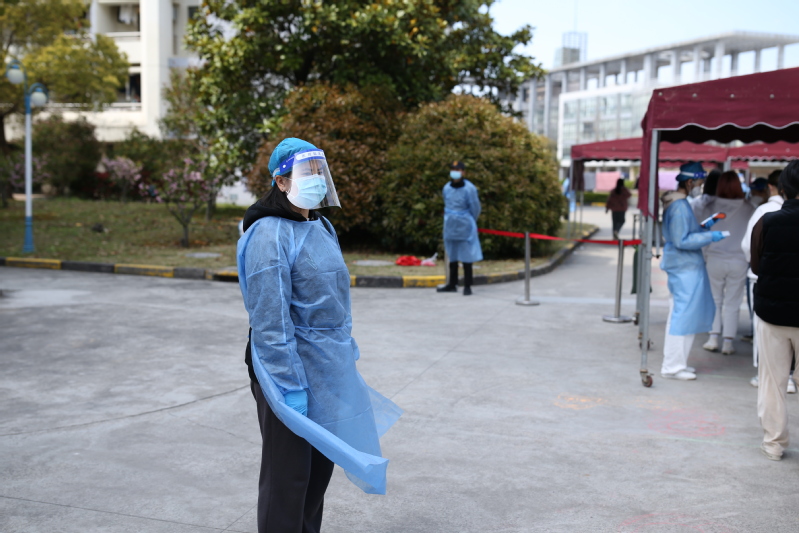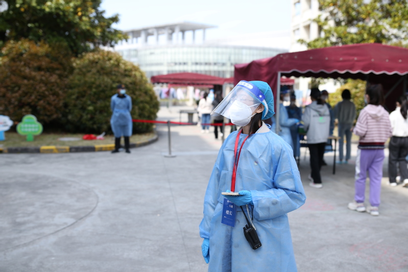 3月14日,这是张佳怡刚刚举办完婚礼后的第二周,她收拾行李离开家,进入了封控的徐汇校区。从此,校园里每一天都能看见她骑着单车往来的身影。大白、小蓝、校园骑手、数据排摸,每一个角色她都努力执行、用心做好,与公司师生齐心协力,做好疫情防控工作。此外,她还同时与奉贤校区的团学组织持续保持联系,做好各类线上线下的活动设计与组织。