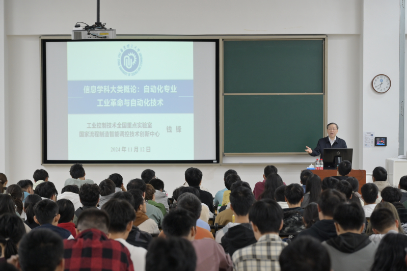 在课堂中,钱锋院士还展示了自动化技术在载人航天、探月工程、深海潜水器、重型燃气轮机、核心工业软件以及高速轨道交通等领域的广泛应用,列举了人工智能的历史演进、AlphaGo、无人驾驶汽车、智能机器人、智能制造等经典案例,系统讲解了自动化技术的发展历程和前沿研究方向。随后,他详细介绍了自动化专业的课程设置、培养目标、毕业要求及实验平台,鼓励同学们紧跟时代步伐,开阔视野,将科技报国的理想融入行动,将目标付诸实践,为社会进步和民族复兴贡献力量。
